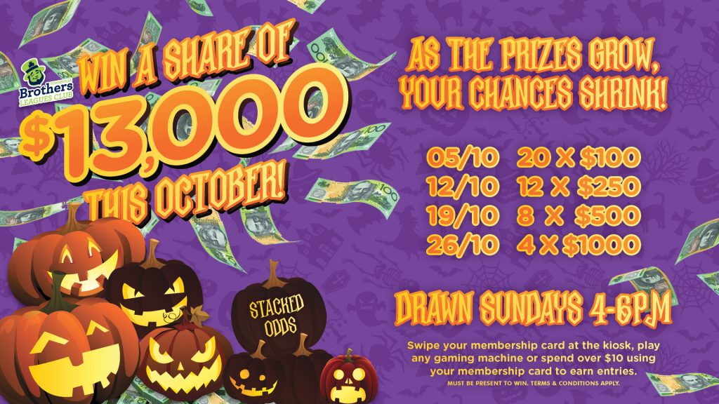 Swipe your membership card at the kiosk, play any gaming machine or spend over $10 using your membership card for your chance to win a share of prizes each month.